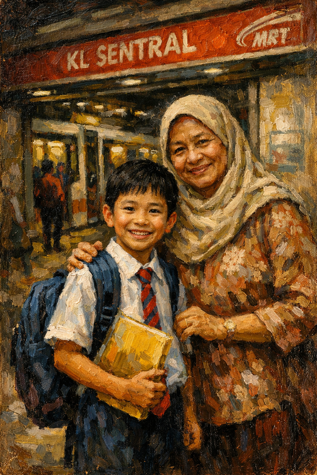 A 10 year old asian boy with his grandmother standing in front of the subway station in Kuala Lumpur. Getting ready to ride the train to school.