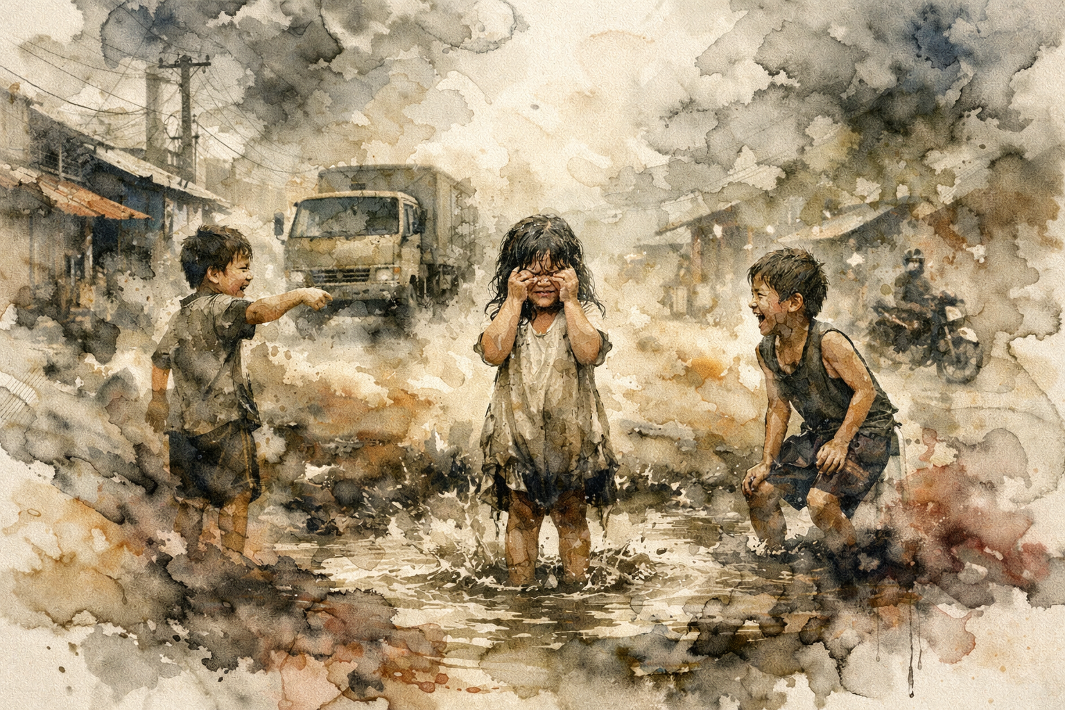 Southeast Asia. Modern day. Nearer to the city now, the bus thumps and bumps to a slower pace. Grinding gears mark spaces between dirty children, playing obliviously in the road. Neither village nor metropolis, outskirts have no identity: Just a blurry line of encroachment; a temporary half-life on the way to something more. Dust springs up from the tires of trucks headed both ways on the road. A little girl stands crying in a mud puddle; her brothers laughing from the sides. She has to learn rejection to participate in this brutal, belonging dance. A little life, and a little death for a product truly worthy of its name: a good woman is hard to find.