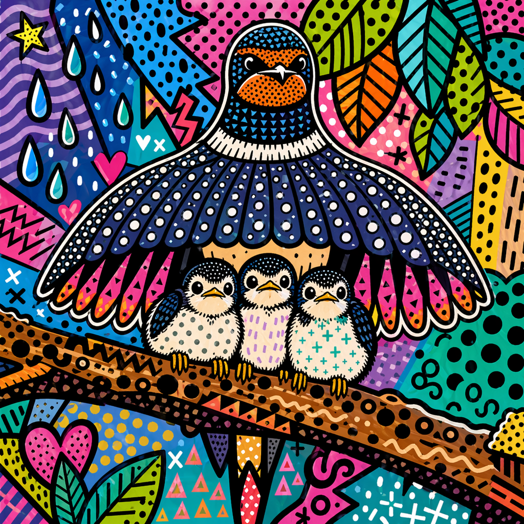 Bold outlined illustrations with vibrant flat colors and playful pattern fills