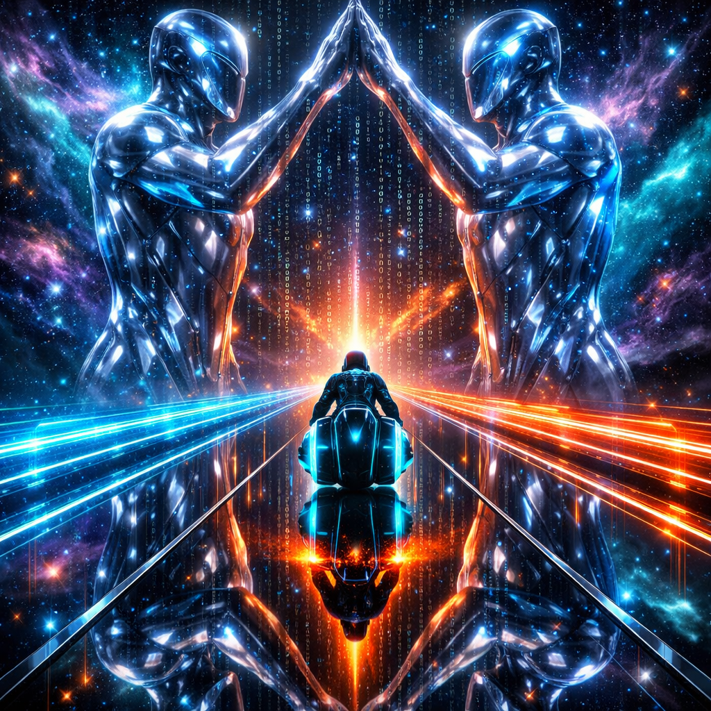 Neon-Futurism Digital Art Style, Bioluminescent Sci-Fi Cosmic Setting, Perfectly Symmetrical Composition. A wide shot looking down a highway that seems to exist in two places at once. The Rider & Bike Consistency: The lone motorcyclist—in the signature sleek, armored suit and helmet—is centered on the hubless "light-cycle." In this scene, the highway is made of a highly reflective, mirror-like black chrome. As the rider speeds forward, a perfect "ghost" reflection of the bike and rider is visible on the surface below, making it look like two twins are racing tire-to-tire. The Path (The Dual Ecliptic): The glowing blue laser-grid highway is perfectly straight, but it is flanked by two parallel streams of data-light that pulse in sync, like a heartbeat. The Gemini Presence: Looming over the path are the colossal Twin Titans. They are rendered as towering figures of translucent silver and electric-blue light. They are positioned facing each other across the highway, their hands nearly touching to form a grand "A-frame" archway over the rider. The Atmosphere: The space between the Twins is filled with shimmering, binary code "snow" and swirling nebulae in shades of teal and indigo. The Action: As the rider passes through the center of the Twins, the "ghost" reflection on the road glows with an intense orange light, while the real rider maintains the cyan glow, representing the two sides of a single soul. Lighting: High-key neon reflections. The silver bodies of the Twins act as mirrors, catching the orange and cyan flashes from the bike and throwing them back across the cosmic void.
