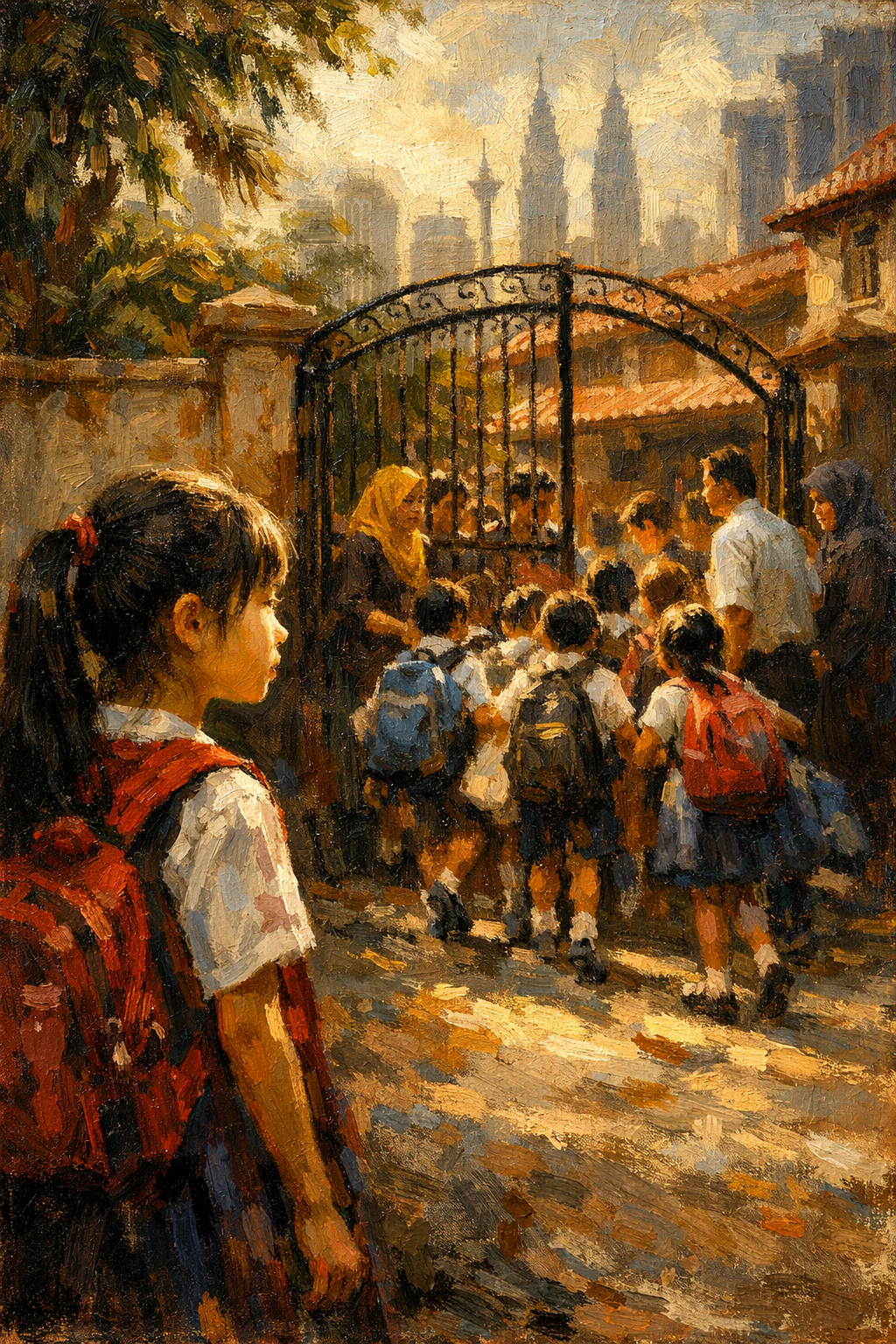 Looking from the street. A 10 year old chinese girl watches as children crowd through the entrance gate at a private school in Kerinchi neighborhood, Kuala Lumpur. Several teachers are also there.