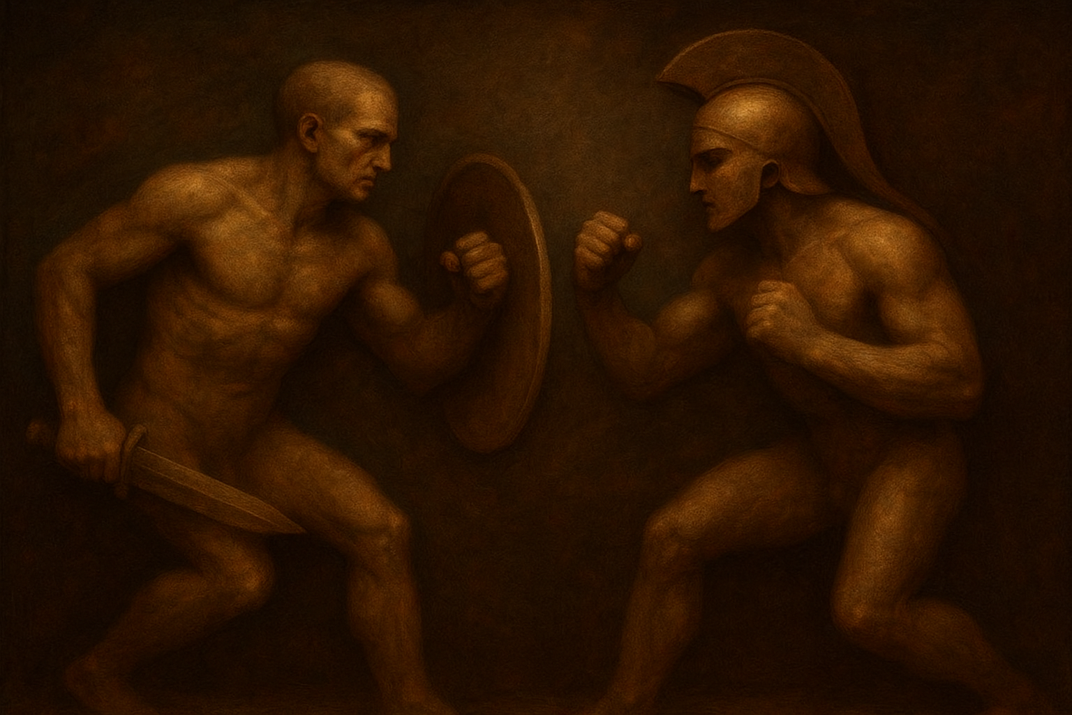 a painting of two men fighting with each other