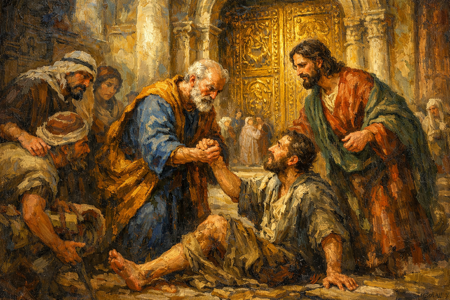 First century Jerusalem at the "gate beautiful" to the temple grounds. Peter and John were going up to the temple at the hour of prayer, the ninth hour. And a man lame from birth was being carried, whom they laid daily at the gate of the temple that is called the Beautiful Gate to ask alms of those entering the temple. Seeing Peter and John about to go into the temple, he asked to receive alms. And Peter directed his gaze at him, as did John, and said, “Look at us.” And he fixed his attention on them, expecting to receive something from them. But Peter said, “I have no silver and gold, but what I do have I give to you. In the name of Jesus Christ of Nazareth, rise up and walk!” And he took him by the right hand and raised him up, and immediately his feet and ankles were made strong.