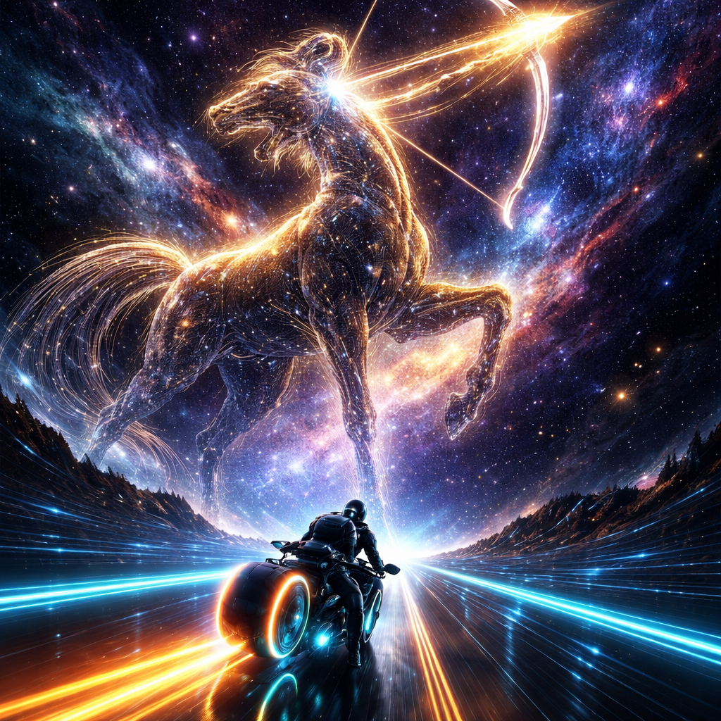 Neon-Futurism Digital Art Style, Bioluminescent Sci-Fi Cosmic Setting, Extreme Low-Angle Perspective. A breathtaking shot looking up from the level of the highway, emphasizing the colossal height of the constellation above. The Rider & Bike Consistency: The lone motorcyclist—in the exact same sleek, armored suit with integrated helmet—is speeding forward on the same hubless "light-cycle" sportbike. The cyan and orange neon wheel rings leave a perfectly straight, vibrant light trail on the road, reflecting off the glossy surface. The Path (The Ecliptic): The glowing blue laser-grid highway continues into the distance, appearing as a thin line of light compared to the massive figure towering over it. The Sagittarius Presence: Looming directly over the highway is the colossal, majestic form of Sagittarius, a centaur made of shimmering stardust and golden data-lines. He is positioned so that the highway passes directly between his towering front legs. Above the rider, the centaur’s torso is twisted as he pulls back a massive longbow made of pure white light. The Action: An arrow of concentrated solar energy is notched in the bow, pointed toward a distant star cluster. The rider is captured in the moment of passing directly beneath the centaur's underbelly, surrounded by the glow of the "horse" body’s starlight. Atmosphere: The scene is dominated by golden and white light from the centaur, contrasting with the deep indigo of the cosmic void and the sharp cyan of the bike's neon.