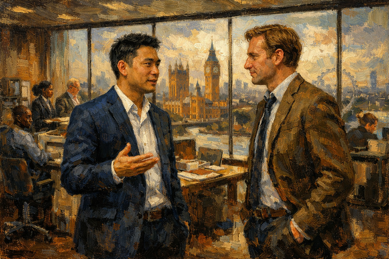 Inside a large office building in London, on the 5th floor, Wing Sun's father, a Chinese Malaysian man in his 30s, speaks to his counterpart in the company, and English man, about business. Other workers are seated at their desks and standing at a copy machine. There are some Black people, but mostly British. One whole wall of the room is glass and we can see something of London outside.