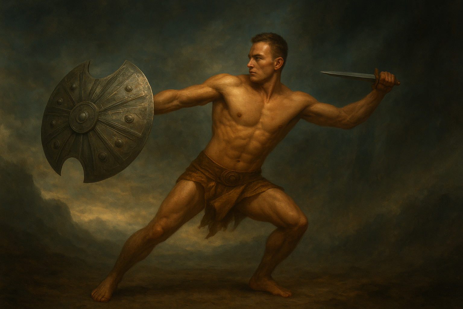 a painting of a man with a sword and shield