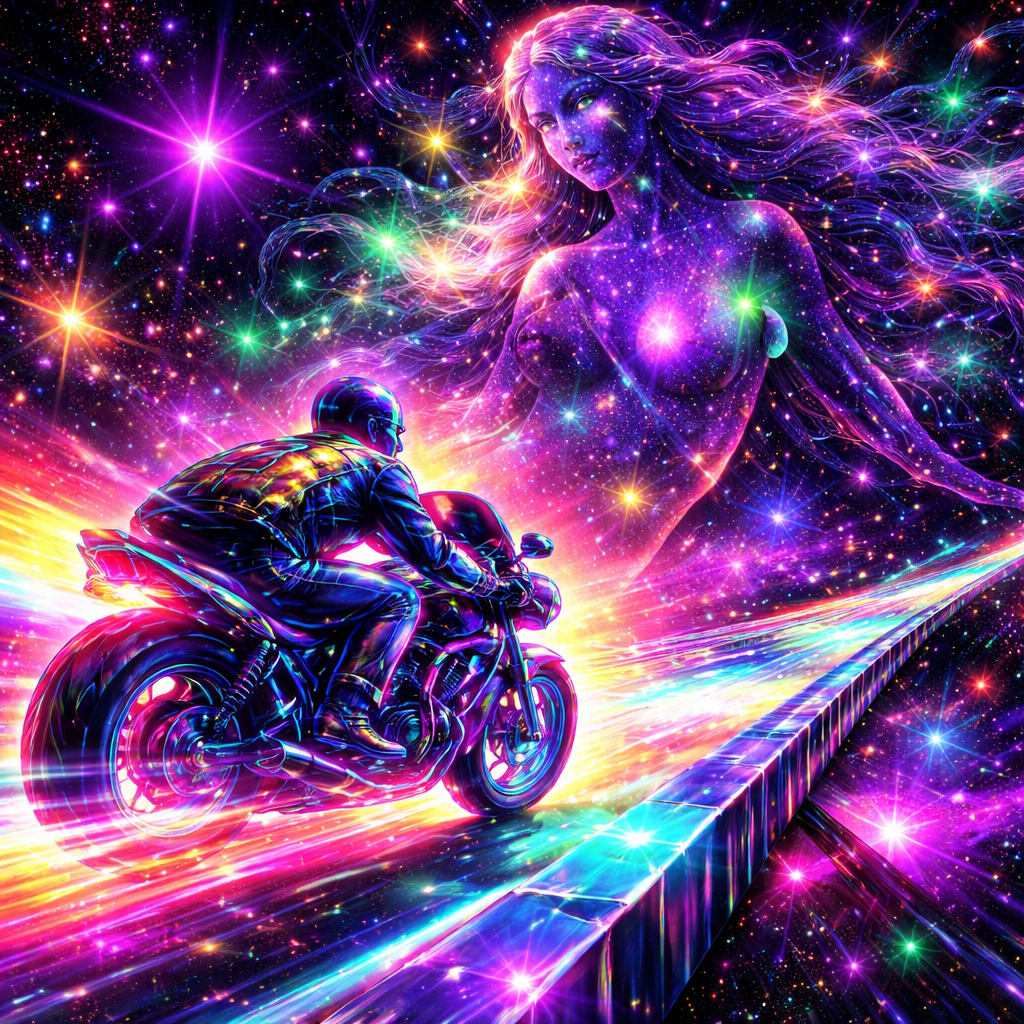 Psychedelic Rotoscope Animation Style, Vibrant Neon Pop-Art, Kinetic 80s Synthwave Aesthetic. A high-energy, multi-colored cosmic chase scene rendered in frenetic, hand-drawn strokes. The Rider & Bike: The "Take On Me" hero is hunched over his motorcycle, but instead of graphite, he and the bike are composed of glowing electric-blue and hot-pink outlines. His leather jacket shimmers with iridescent "oil-slick" colors. As the bike tears forward, it leaves behind a shimmering rainbow exhaust trail that ribbons across the dark sky. The Ecliptic & Virgo: They are riding along the Ecliptic, which is depicted as a glowing, multi-colored crystalline highway cutting through space. In the background, the constellation Virgo is a colossal, majestic goddess made of swirling violet nebulae, emerald star-clusters, and golden stardust. Her hair flows like a galactic aurora, filling the frame with a kaleidoscope of saturated colors. The Atmosphere: The blackness of space is replaced with a deep indigo and magenta gradient, crowded with exploding supernovas, prismatic stars, and neon lens flares. Every line should look like a vibrating, colorful energy stroke, creating a scene that is "loud," bright, and intensely colorful.