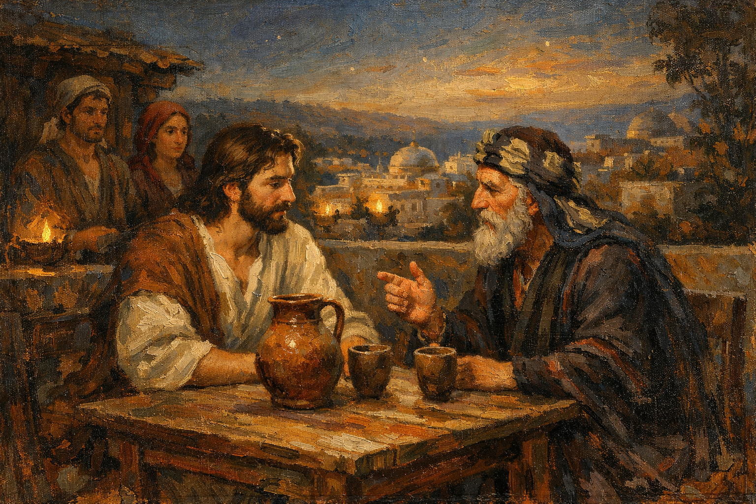 First century Palestine. An evening scene on a rooftop in Bethlehem. The summer air is warm and the evening light is soft. Jesus, wearing ordinary clothing like most men wear, sits at a table across from a Pharisee named Nicodemus who has come to speak to the Master privately. One or two servers stand nearby. There is a clay pitcher and 2 drinking cups on the table. The town is visible in the background.