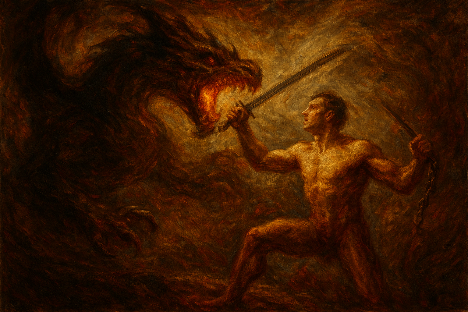 a painting of a man holding a sword in front of a demon