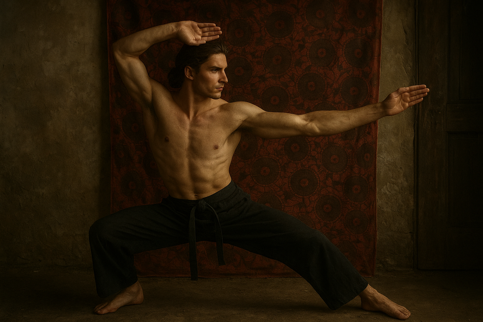 a shirtless man doing a yoga pose in front of a red wall