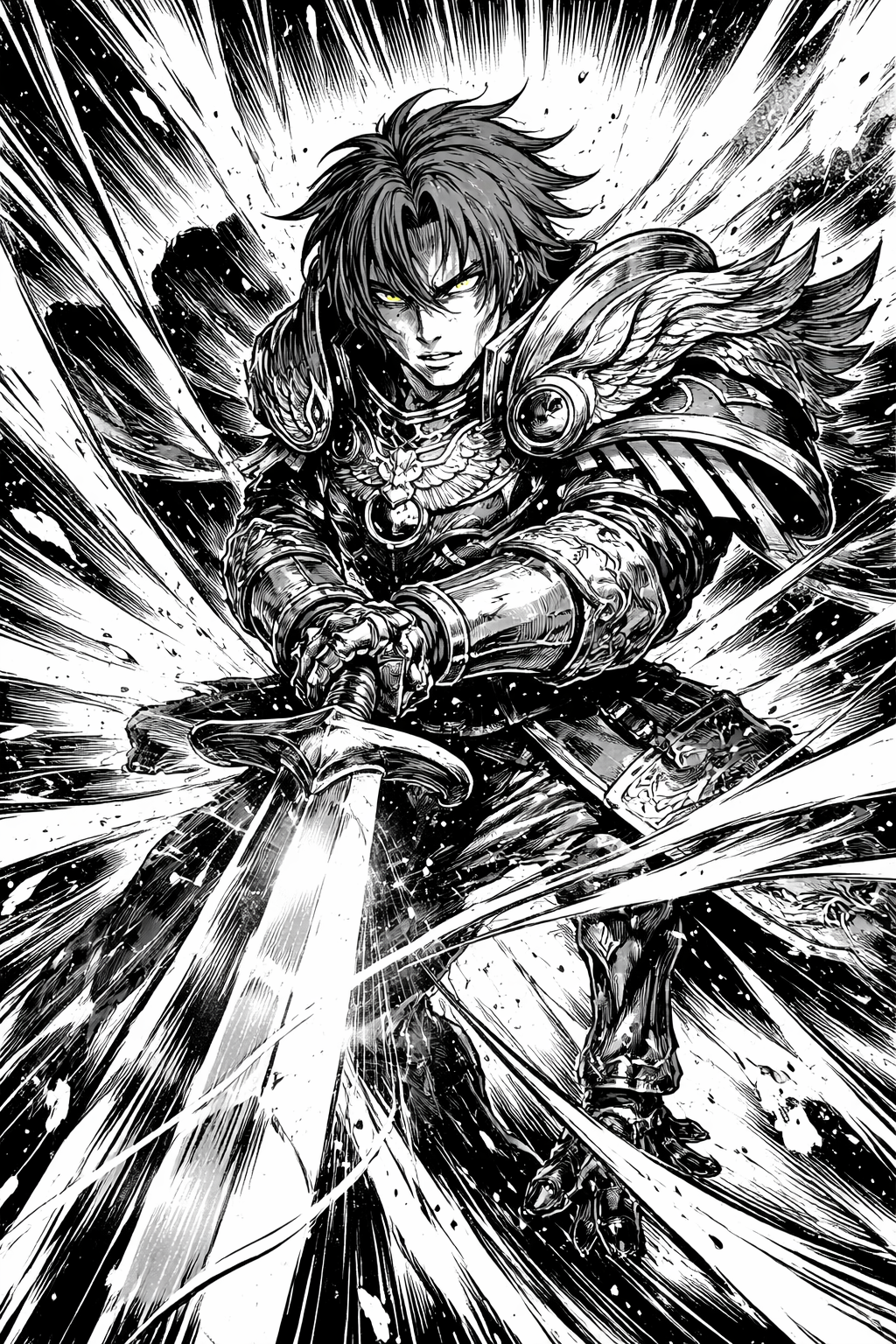 This shonen battle manga art style emphasizes dynamic action through bold ink work and explosive panel layouts. Featuring heavy speed lines, impact bursts, and dramatic facial expressions, it captures the intensity of combat scenes in black and white.