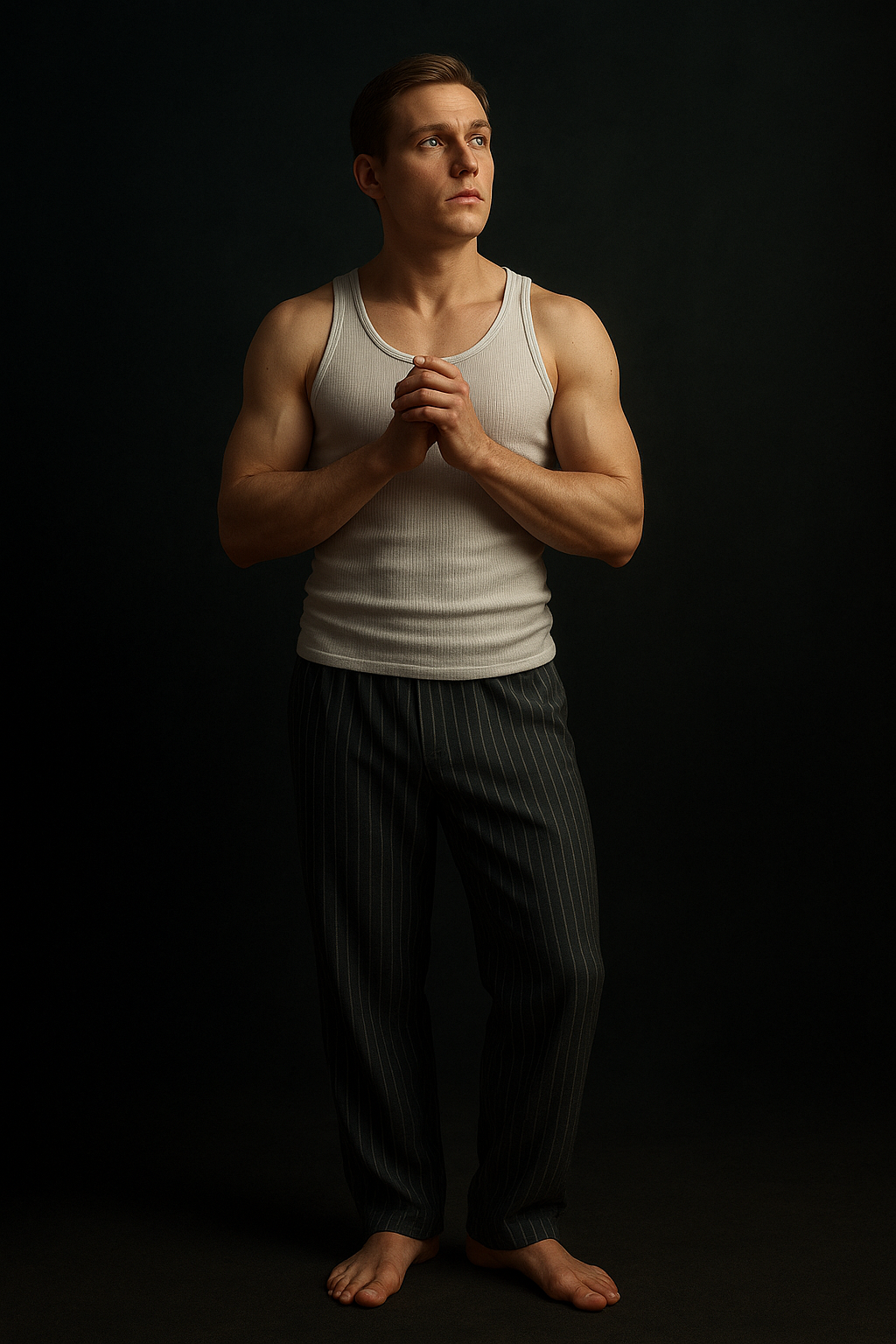 a man in a tank top standing with his hands folded