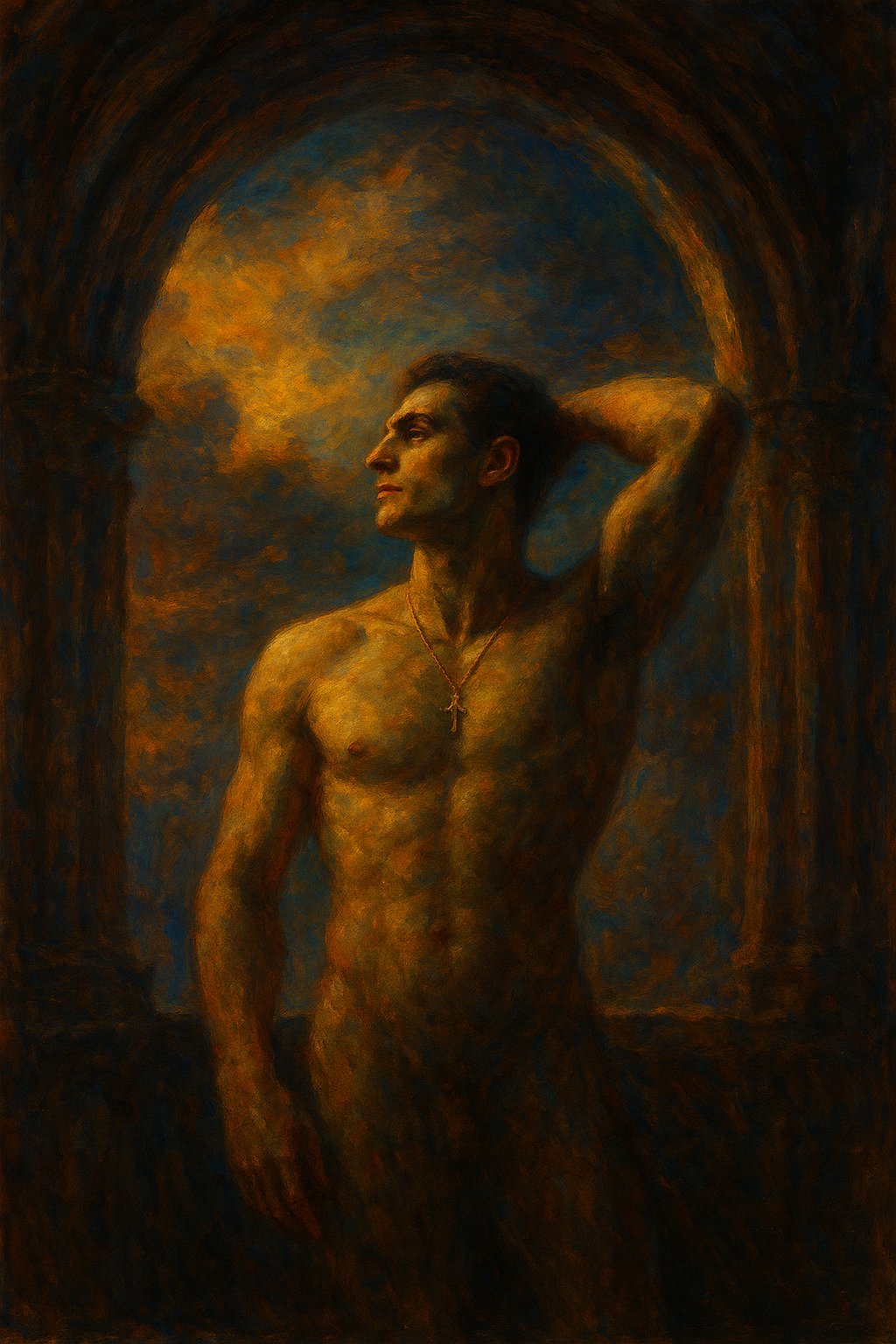 a painting of a man with no shirt on