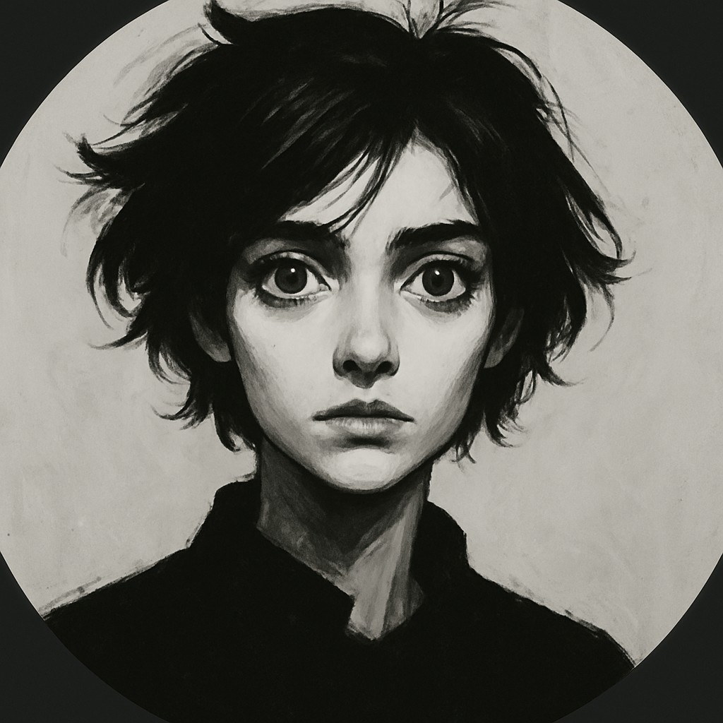 This style features a stark, monochromatic palette, predominantly using shades of white, gray, and black to create a moody and intense atmosphere. It employs crisp lines and fluid brushstrokes, often incorporating abstract elements like bold, painterly marks that interact with more refined rendering. There is a strong play of light and shadow to define forms and convey depth, contributing to a sense of dramatic contrast and emotional depth. The overall aesthetic is minimalist yet expressive, often focusing on nuanced detailing in facial features and hair, while maintaining a smooth and clean finish.