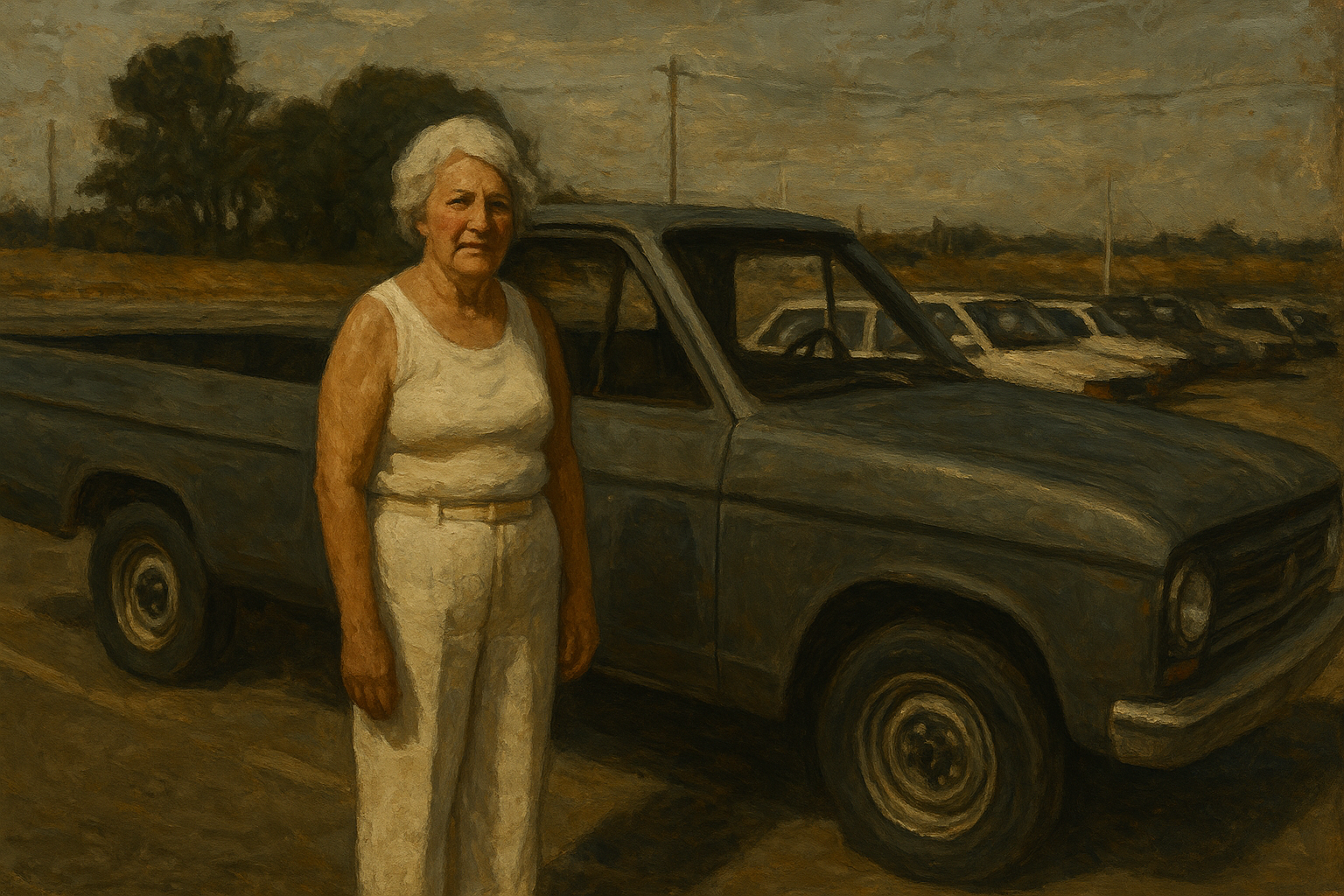 a painting of a woman standing next to a truck