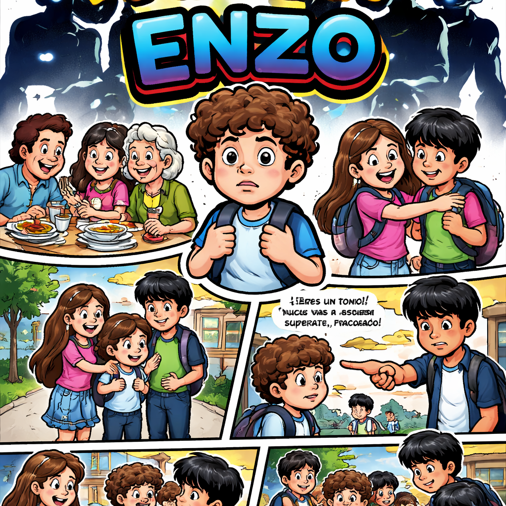 En la portada quiero un niño pequeño de 12años de piel blanca y pelo rizo de tras de el quiero 4 sombras como fantasma y de título de la portada se llama las 4 sombras de Enzo en la primera escena se presenta la familia de Enzo su mamá, papa y su abuela centados cenando y riéndose como una gran familia feliz en la segunda escena quiero que Enzo y lili niña de 12 año pelo café y de vestido rosa su mejor amiga salgan abrazados como mejores amigo tercer escena Enzo y lili hiendo a la escuela cuarta escena la mamá de Enzo lo va a traer a la escuela y lo mira Hugo niño de 12 años un poco alto de piel morena pelo liso con cara de odio al ver la escena de que Enzo si lo va a traer su mamá quinta escena día siguiente comienza los insulto de Hugo hacia Enzo diciendo cosas hírientes como eres un tonto, nunca vas a superarte, fracasado Enzo se puso a pensar por que su compañeros le decía eso sexta escena lili vio que tenían a Enzo rodeado A fuera de la escuela Hugo y 3 chicos más de la misma edad de Hugo 13 años lili les