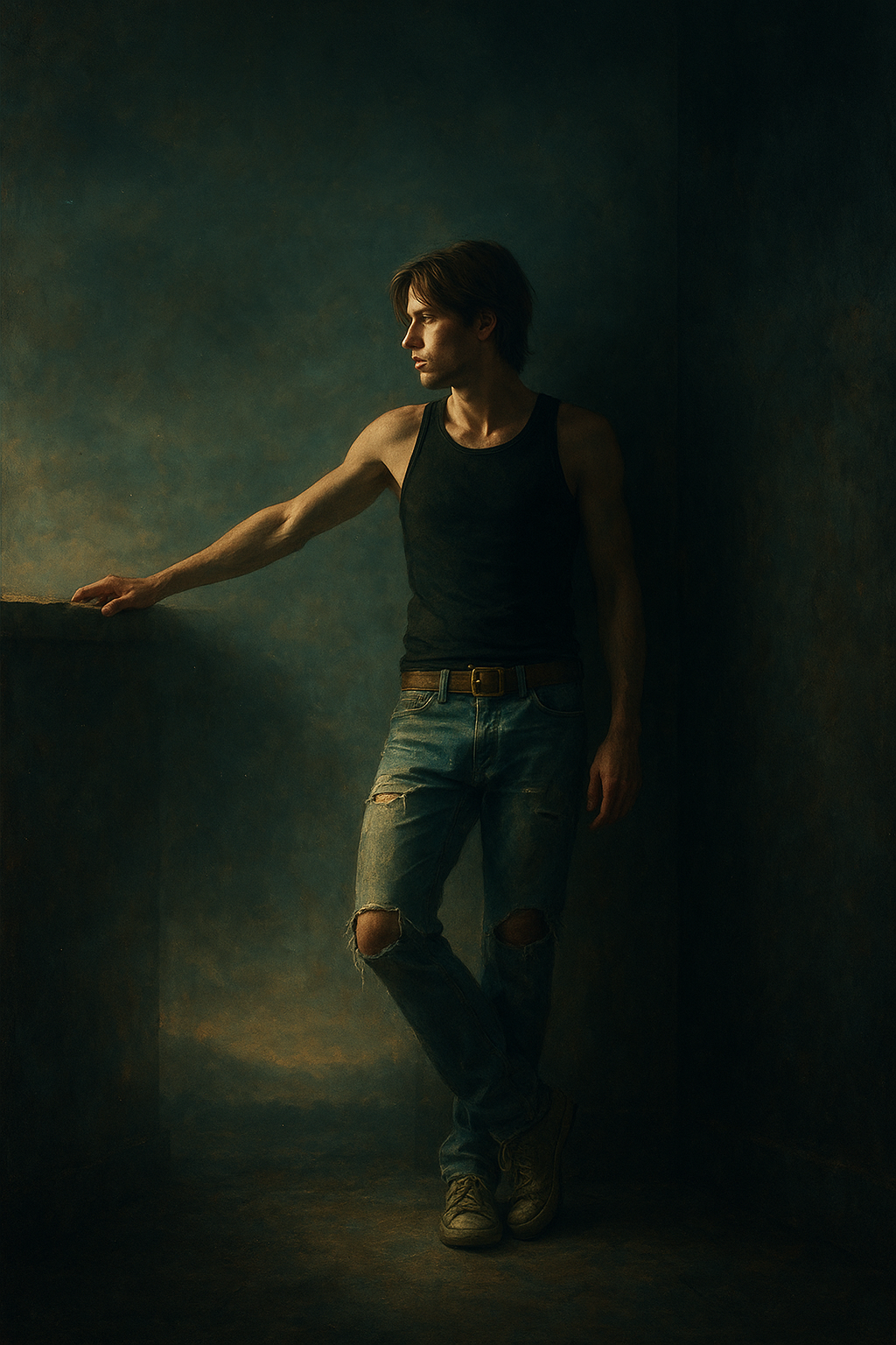 a man in a tank top leaning against a wall