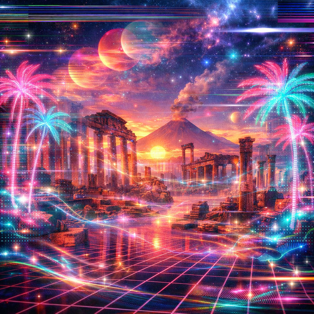 Surreal vaporwave landscape at sunset, ancient Pompeo from checkered grid floor, neon palm trees glowing pink and teal, VHS glitch effects, retro 90s aesthetic, dreamy nostalgic atmosphere, high detail