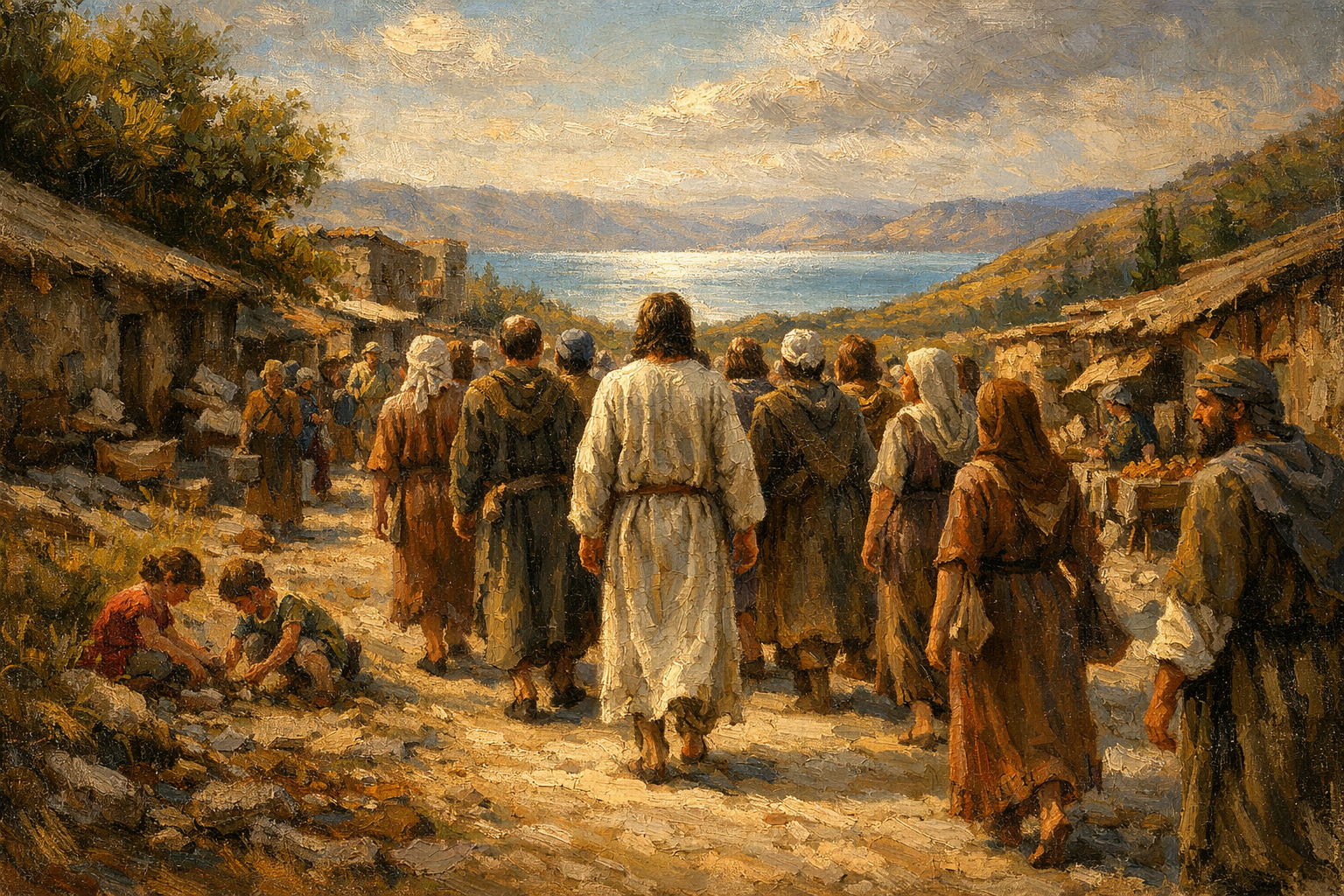 First century Palestine. Jesus walks away from the camera down a road that goes through town with several of His disciples. Jesus wears a plain robe like most ordinary men. The other people are dressed like peasants, farmers, and tradesmen. There are also women in the group, wearing plain, everyday clothing. Some children are playing near the roadside. The Sea of Galilee shines in the far distance.