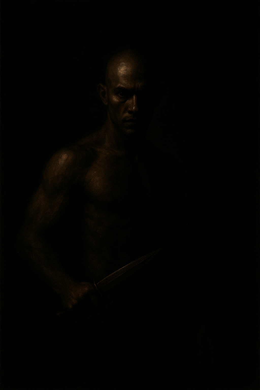 a man holding a knife in a dark room