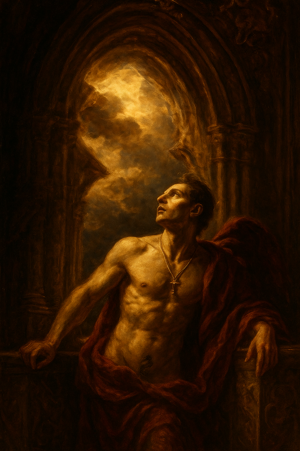 Dramatic Catholic art style featuring intense emotion, dynamic movement, and theatrical lighting to inspire religious devotion.