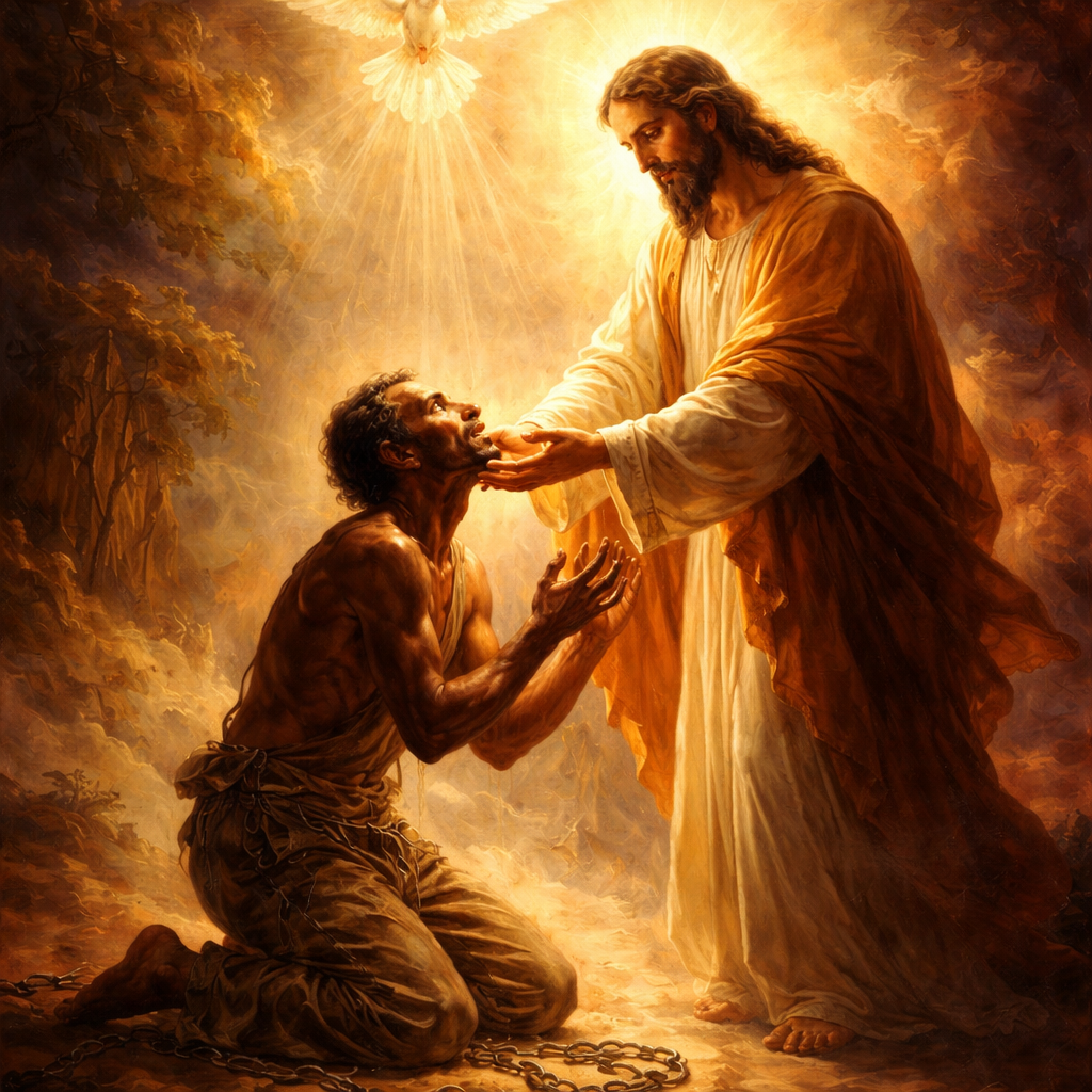 A powerfully emotional, classical sacred art style painting. A ragged figure, formerly a slave, is kneeling, their hands reaching out in submission and relief. Their heavy, rusty chains have been shattered on the dusty ground. Before them is a figure enveloped in radiant, warm, golden light (representing Christ Jesus), whose hand is gently lifting the kneeling person's chin. Above them, a shimmering dove made of pure light descends, symbolizing the Spirit of adoption witnessing to their spirit. Themes of mercy, freedom, and homecoming. Chiaroscuro lighting, deep colors.