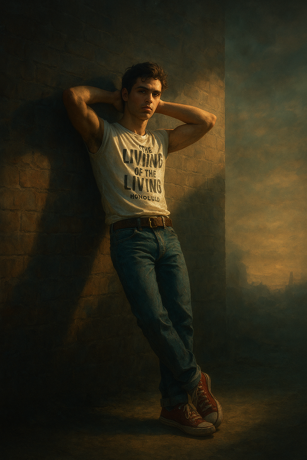 a young man leaning against a brick wall