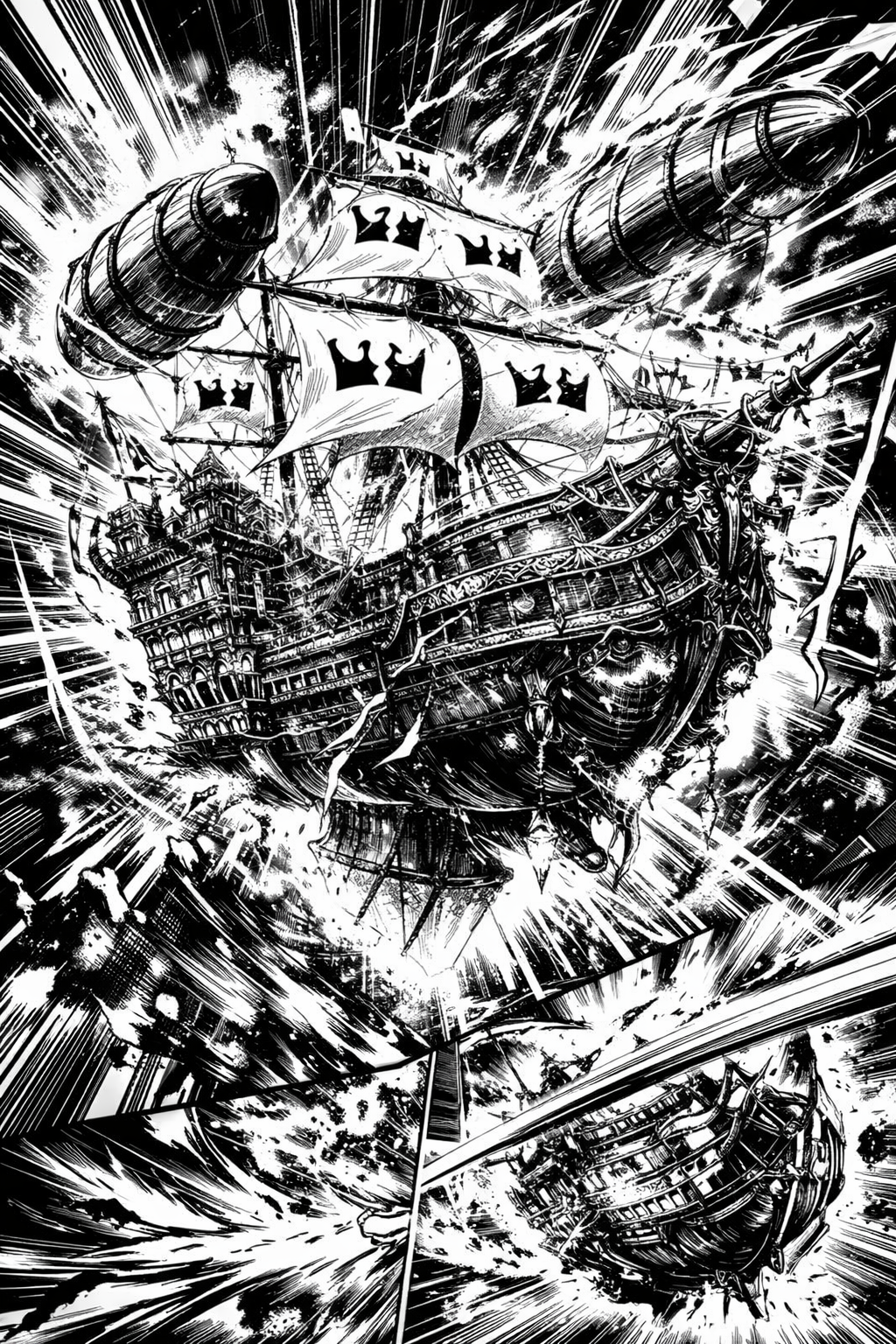 This shonen battle manga art style emphasizes dynamic action through bold ink work and explosive panel layouts. Featuring heavy speed lines, impact bursts, and dramatic facial expressions, it captures the intensity of combat scenes in black and white.