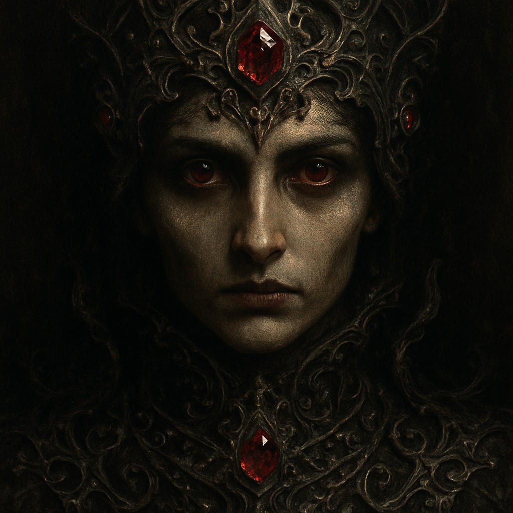 Dark romantic pieces featuring crosses, skulls, and medieval motifs with dramatic black metals and blood-red stones.