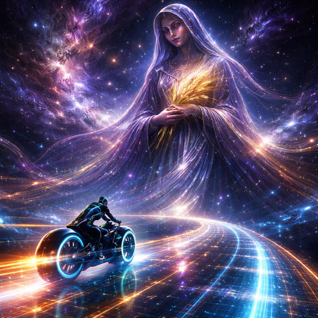 Neon-Futurism Digital Art Style, Bioluminescent Sci-Fi Cosmic Setting. A sleek, futuristic scene set deep in the interstellar void, with absolutely no Earth terrain, asphalt, or atmosphere visible. The Path (The Ecliptic): The "road" is a floating, translucent highway constructed entirely of glowing blue and orange laser grids and condensed stardust, arcing through infinite dark space. The Rider: A lone rider on a futuristic, hubless "light-cycle" sportbike speeds along this cosmic path. The rider is fully encased in a sleek, glowing armored suit with an integrated full-face helmet, leaving a vibrant neon light trail behind them. The Constellation (Modest Virgo): Dominating the cosmic background is the immense celestial avatar of Virgo, portrayed with a traditional, honorable, and modest virginal look. She is fully clothed in voluminous, flowing robes woven from shimmering stardust, deep violet nebulae, and golden light threads that cover her from neck to toe. A dignified, star-studded veil or hood frames her face. She is a majestic, modest queen of the cosmos, holding a sheaf of wheat made of glowing stars, looking down calmly at the rider.