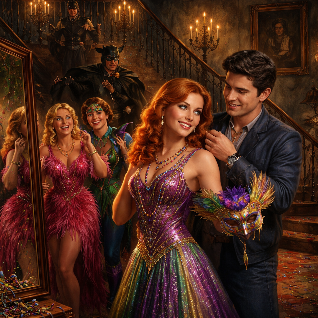 Atmospheric interior scene from Nancy Drew book #81 The Mardi Gras Mystery, set inside the grand, dimly lit Seaton Mansion nicknamed 'Bat Hollow' in New Orleans during Mardi Gras. Teenage detective Nancy Drew with her classic reddish-blonde hair, blue eyes, and determined smile, trying on an elegant masquerade costume—perhaps a sparkling gown with purple, green, and gold accents, feathered mask in hand, beads around her neck. Her friends Bess (blonde, bubbly, in a glamorous pink feathered outfit) and George (short dark hair, athletic, in a fun jester or adventurous costume) are nearby, laughing and adjusting outfits in front of a large antique mirror. Ned Nickerson helps Nancy with a clasp, smiling. In the background: Brian Seaton and his father Bartholomew in partial bat-themed costumes (capes, masks with bat ears/wings), an old grand staircase with wrought-iron details, flickering candlelight or chandeliers casting shadows, antique furniture, a framed portrait on the wall hinting at the stolen painting mystery, Mardi Gras beads and confetti scattered around. Moody yet festive lighting—warm glows against dark wood paneling and high ceilings—evoking a haunted Southern mansion vibe mixed with holiday excitement. 1980s Nancy Drew book illustration style, adventurous, detailed costumes, cinematic composition, vibrant colors popping against gothic shadows
