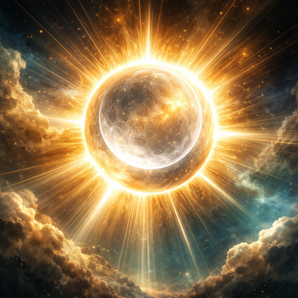 Ancient celestial vision: the blazing sun unites with a completely translucent moon, the moon rendered invisible except for a silvery faint outline, swallowed by the sun's overwhelming radiance yet delicately outlined as a glass, beams of divine light pouring through, the moon spiritual symbolism of hidden union and concealed intimacy, ethereal golden and silver tones, sun and moon the same size, golden rays enveloping a transparent moon. Moon is ethereal and the sky is blue. It is like the silver of the moon's features are upon the sun. brilliant light within the moon