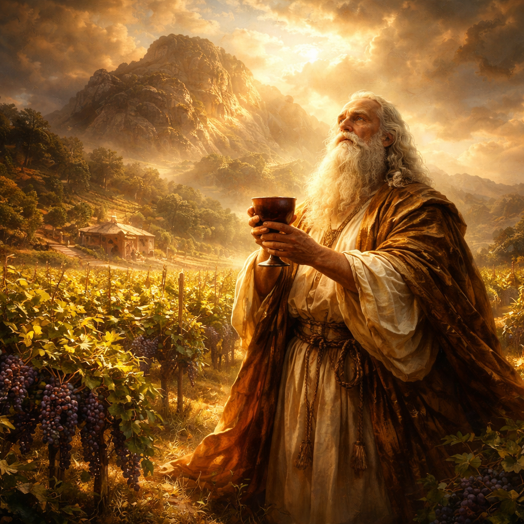 A high-detail cinematic wide shot of Noah, an elderly but robust patriarch with a long white beard and linen robes, standing in a lush vineyard on the slopes of the craggy Mount Lubar. He is holding a clay chalice of deep red wine. In the background, rows of vibrant green grapevines are heavy with purple fruit. The lighting is the golden hour of a Mediterranean sunset, casting long shadows. Ancient stone altars are visible in the distance. 8k resolution, photorealistic, historical epic style.