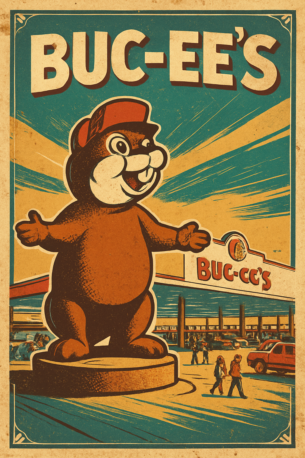 Generate a vibrant, wide-angle image capturing the overwhelming scale and festive atmosphere of a Buc-ee's travel center during peak daylight hours. The central focus should be the massive, iconic Buc-ee the Beaver mascot statue at the entrance, welcoming visitors. Show the enormous, brightly lit gas station canopy stretching across dozens of pumps, with a continuous flow of cars and trucks. In the background, feature the distinctive red-roofed store building with its huge signage. Include details that convey the bustling energy: families walking in, people filling up their tanks, and the overall sense of a colossal, well-organized 'roadside attraction.' The image should highlight its cleanliness, vastness, and the unique, almost surreal experience of stopping at a Buc-ee's.