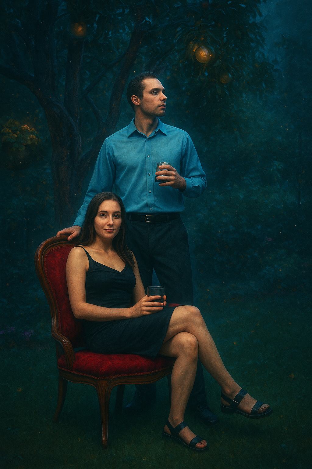 a man standing next to a woman on a red chair