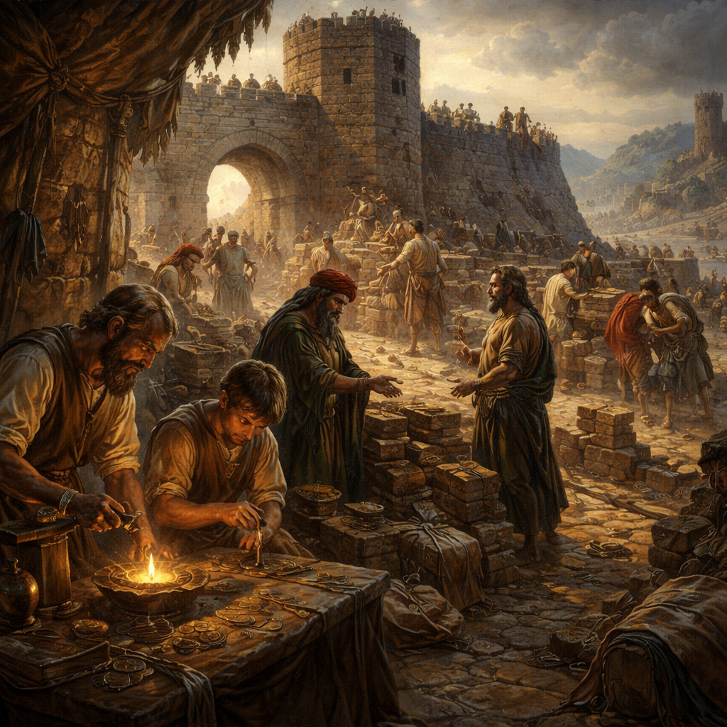 Express without words “After him repaired Malchiah the goldsmith's son unto the place of the Nethinims, and of the merchants, over against the gate Miphkad, and to the going up of the corner. And between the going up of the corner unto the sheep gate repaired the goldsmiths and the merchants.” (Nehemiah 3:31-32, KJV)