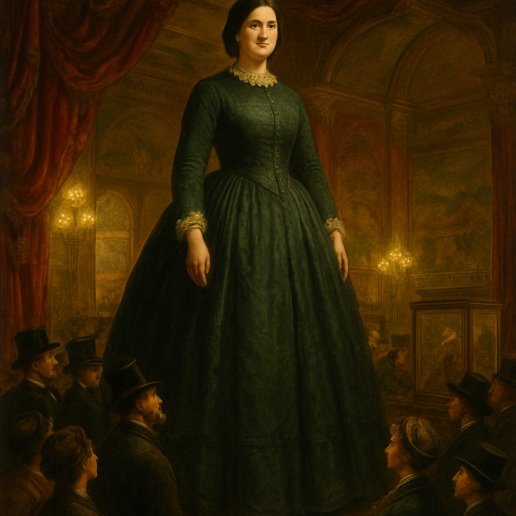 Victorian Oil Painting Art Style, Historical Digital Art Style, a rich and detailed full-body portrait of the famous giantess Anna Swan standing in the center of a lavish, gaslit exhibition hall at P.T. Barnum's American Museum in the 1860s. She is towering over the surrounding crowd of average-sized gentlemen in top hats and ladies in bonnets, whose heads only reach her waistline; they look up at her with expressions of awe and curiosity. Anna is dressed with immense dignity in a fashionable, expansive Victorian silk gown with a crinoline hoop skirt, tailored bodice, and lace trim. Her face is gentle, intelligent, and composed. The background is crowded with heavy red velvet drapery, gilded architectural details, curiosities in glass cases, and painted circus banners faintly visible. The lighting is warm, dramatic gaslight, creating deep shadows and highlighting the rich fabrics and the incredible scale of Anna Swan compared to her environment.