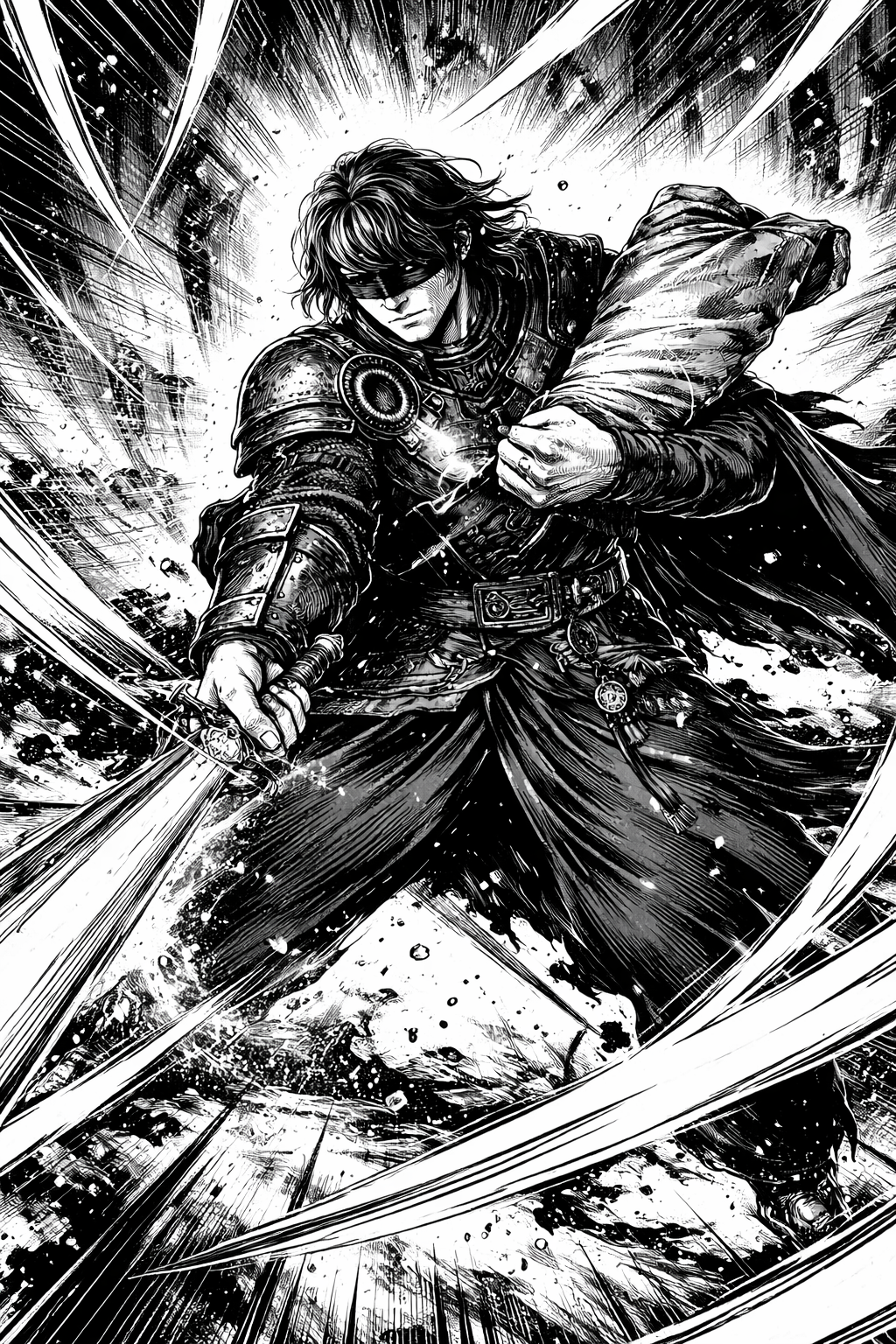 This shonen battle manga art style emphasizes dynamic action through bold ink work and explosive panel layouts. Featuring heavy speed lines, impact bursts, and dramatic facial expressions, it captures the intensity of combat scenes in black and white.