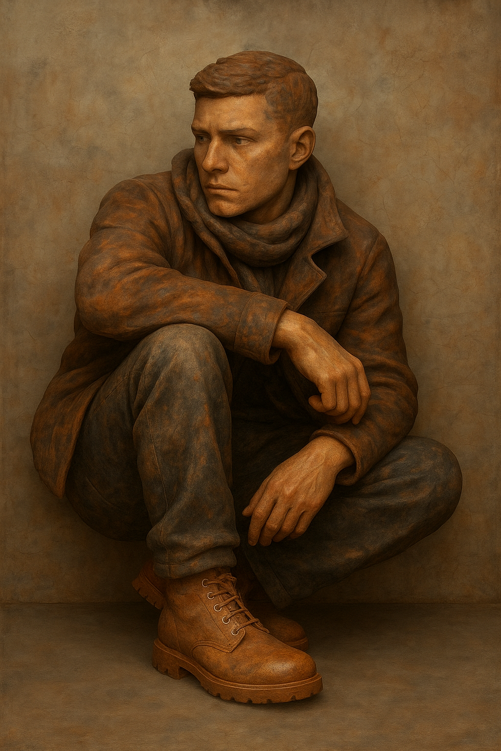 a painting of a man sitting on the ground