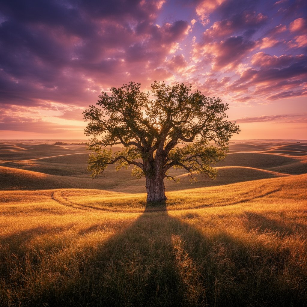 Epic Landscape Photography Style, Wide-Angle Lens, Golden Hour Lighting. A profound, sweeping photograph of a single, colossal ancient Eastern Cottonwood tree standing isolated in the center of a vast expanse of the Nebraska rolling highlands (Sandhills). The Tree: It is massive and gnarled, a true sentinel of the plains, with a thick, deeply fissured trunk and sprawling, asymmetrical branches shaped by years of constant wind. The Environment: The surrounding landscape is a sea of undulating, gentle hills covered in knee-high mixed-grass prairie that glows coppery-gold and sage-green in the late afternoon light. The grasses are visibly swaying in the breeze. A faint, winding dirt track leads toward the horizon. The Sky & Light: The sky is immense and dramatic, taking up two-thirds of the frame, filled with textured cumulus clouds catching the brilliant oranges, deep purples, and soft pinks of the sunset. The light is warm, casting long shadows across the folds of the hills. The mood is quiet, vast, and solitary.
