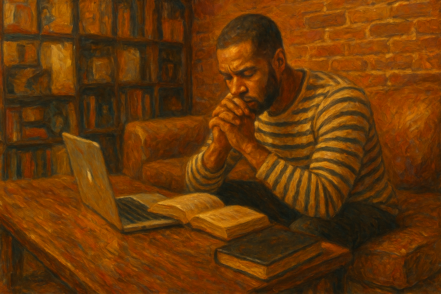 a painting of a man sitting at a table in front of a laptop