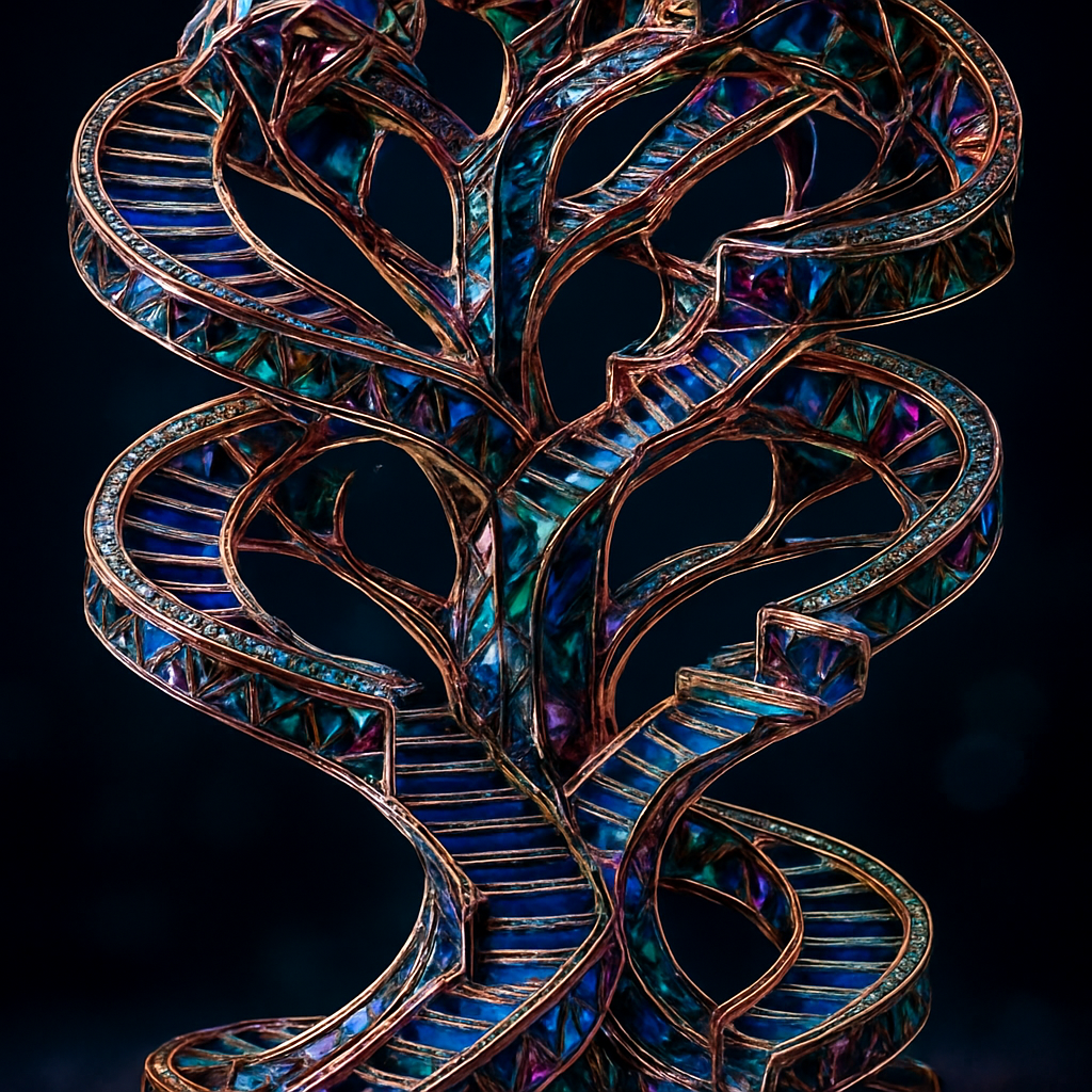 in the style of M.C. Escher, an array of endless staircases of impossible loops and bi-directional pathways, spiraling through a giant tree, Cinematic vibrant reflective jewel-toned colors, black background