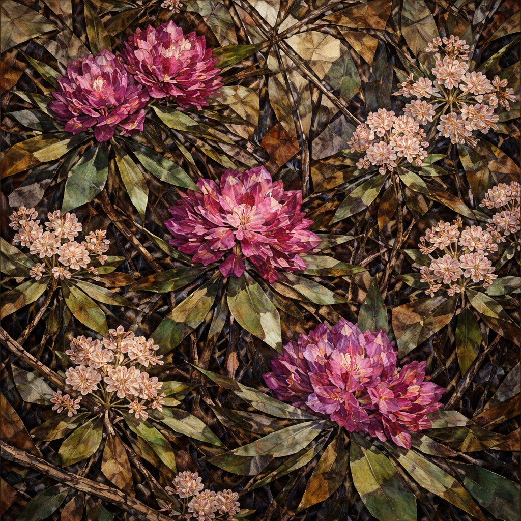 The Mountain Laurels: The smaller, intricate flowers are rendered as complex, repeating geometric star-patterns and angular cups in white and pale pink with distinct red polygonal markings.