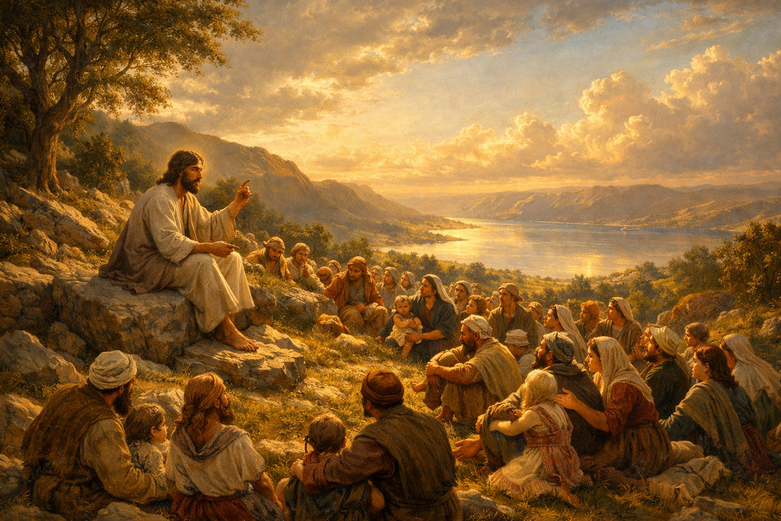 First century Palestine. Jesus sits on a rock on a hillside teaching a large group of His disciples. The Sermon on the Mount. Jesus wears a plain robe like most ordinary men. Jesus' face is kind, but intense, as He teaches. The other people are mostly peasants, farmers, and tradesmen. There are also women present, wearing plain, everyday clothing. Some couples have also brought their children. The Sea of Galilee shines in the far distance.