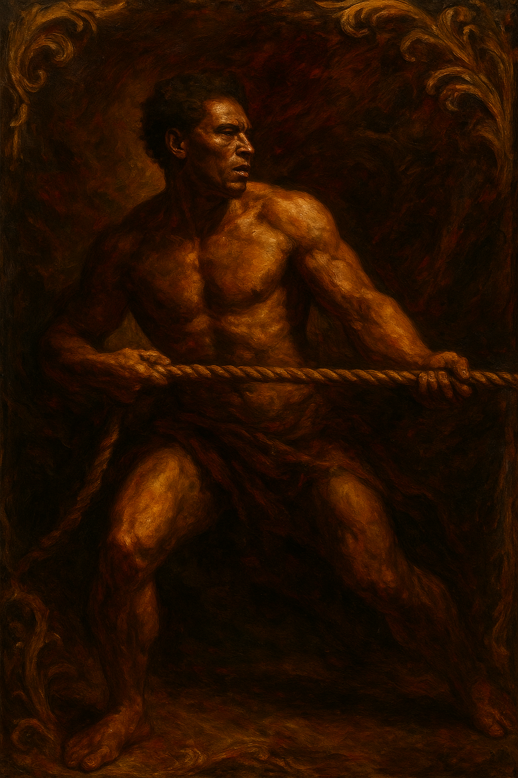 a painting of a man holding a rope