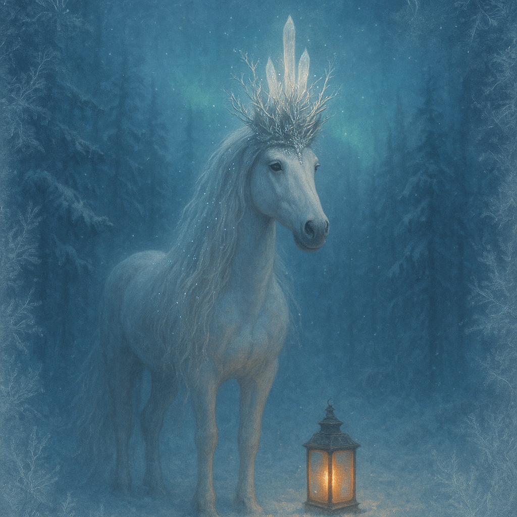 "A majestic white horse standing in a deep, snow-covered forest as a guardian of the winter solstice. The horse wears an intricate crown made of frosted silver branches and glowing quartz crystals. Fine starlight sparkles are woven into its long, flowing mane. A single vintage lantern sits on the snow at its feet, casting a warm, golden candlelight glow against the blue twilight. In the background, a faint aurora borealis dances through the trees. The style is whimsical and surreal, with a soft, painterly photographic quality—prioritizing quiet magic over loud spectacle."