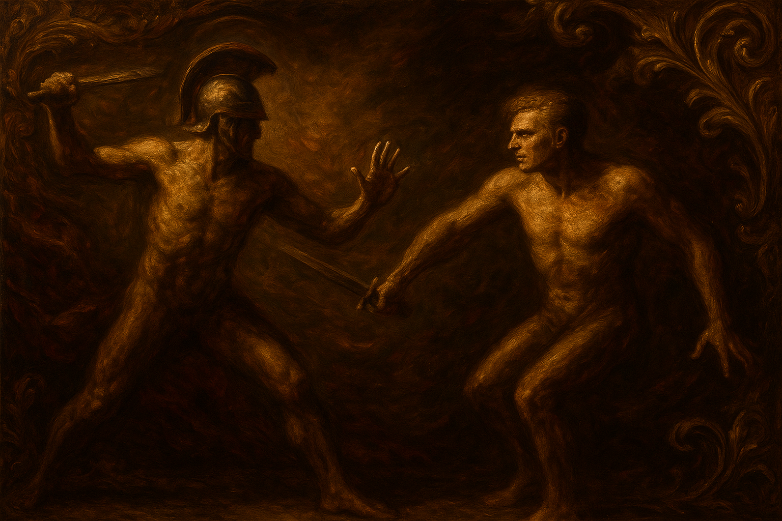 a painting of two men fighting with each other