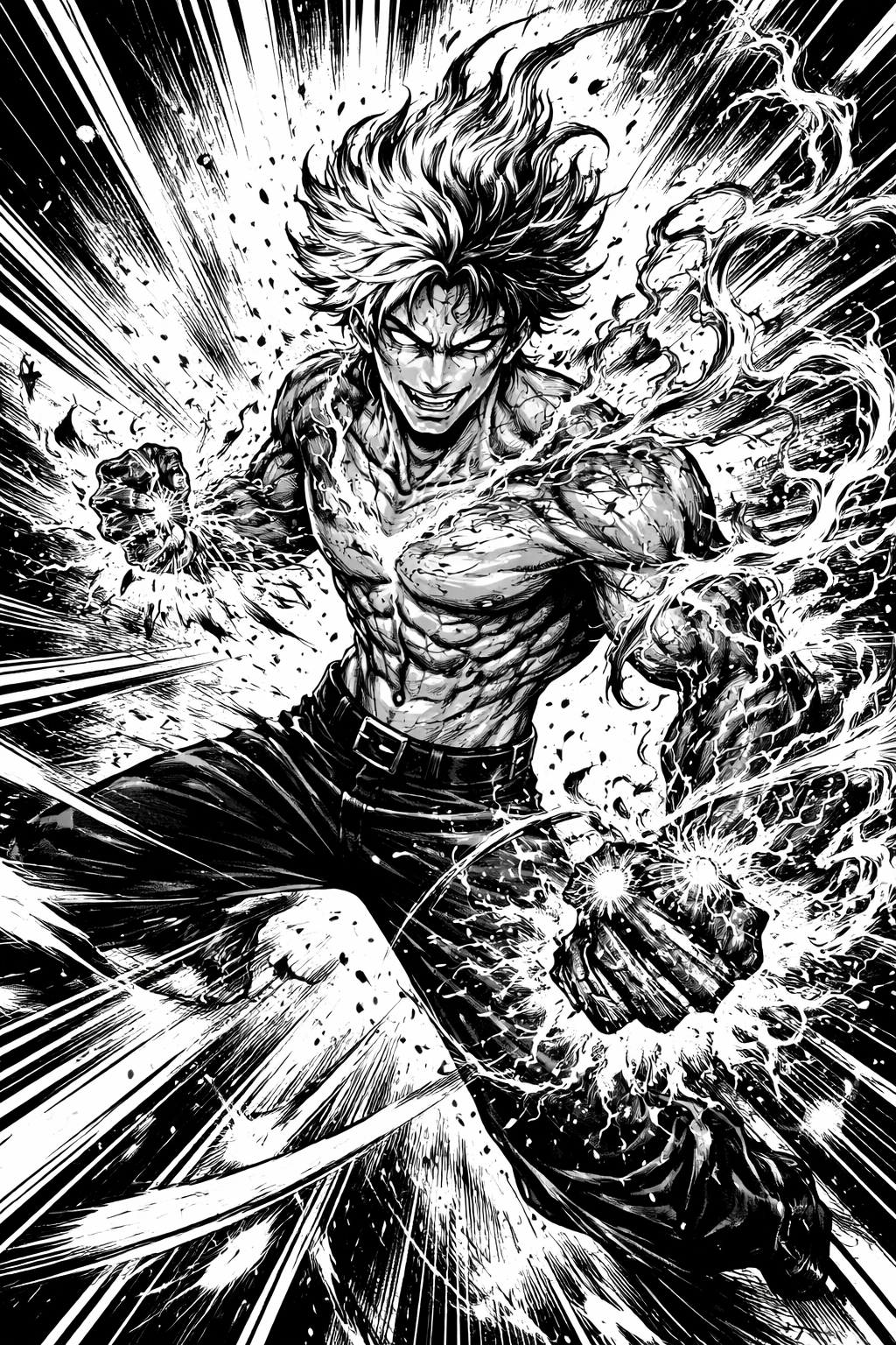 This shonen battle manga art style emphasizes dynamic action through bold ink work and explosive panel layouts. Featuring heavy speed lines, impact bursts, and dramatic facial expressions, it captures the intensity of combat scenes in black and white.