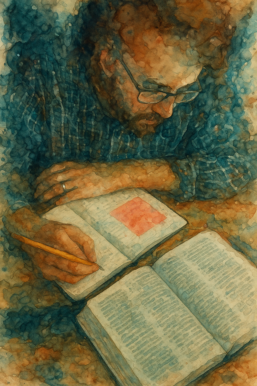 a painting of a man writing on a book