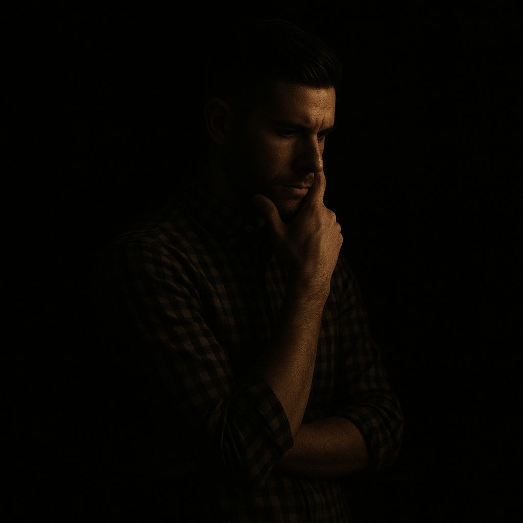 a man standing in the dark with his hand on his chin